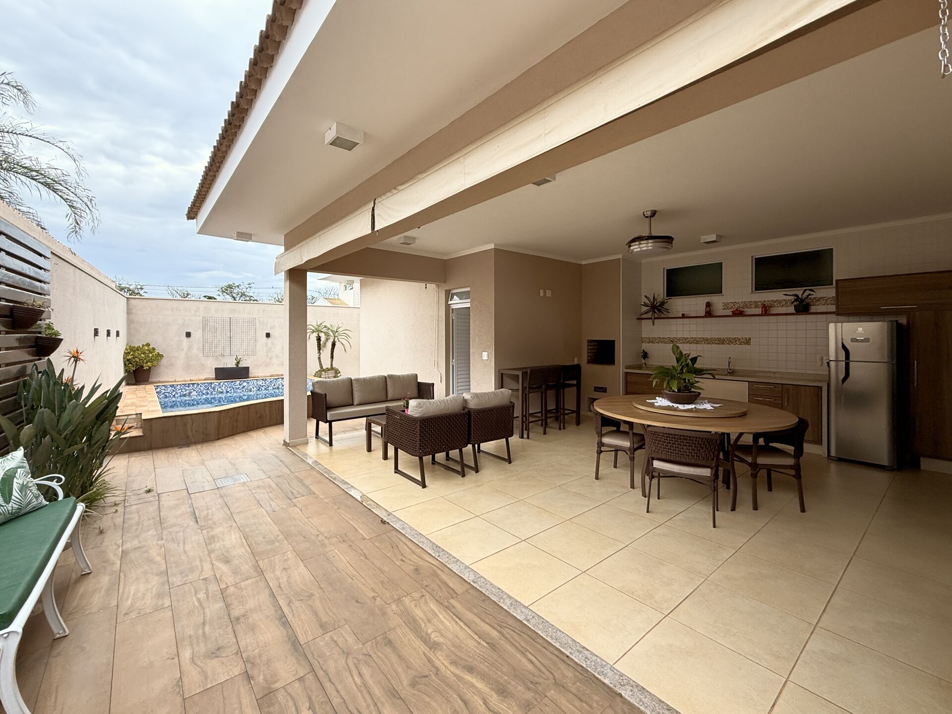 A área íntima é composta por três suítes, sendo a master equipada com closet, todas com armários e piso de taco. Já na área social, a casa conta com espaço gourmet com churrasqueira e piscina com hidromassagem, integrando ambientes funcionais para momentos de relaxamento.